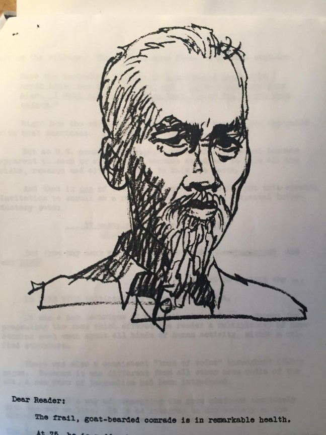 Inside, at the top of the letter, is a compelling image of Ho Chi Minh. Unfortunately, I have only a black-and-white Xerox copy, and did not write down the color of these illustrations. I suspect it was red.